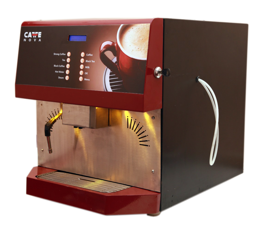 Produces 4–5 cups per minute with adjustable strength. Compact design with LED interface ideal for offices and co-working spaces.